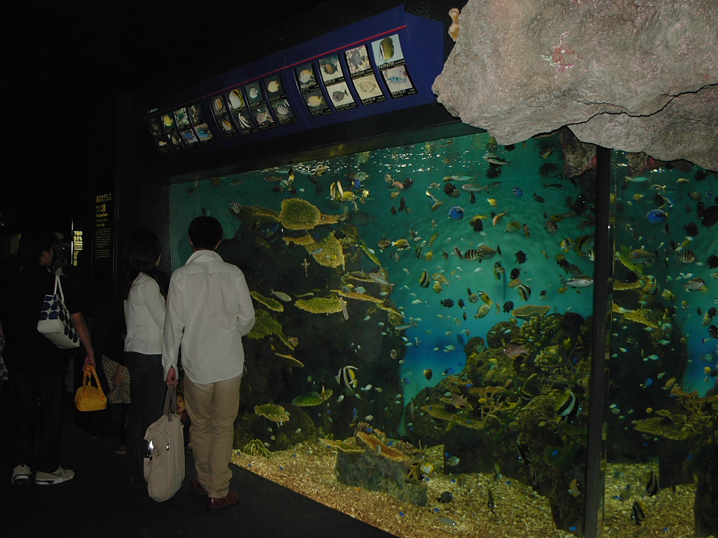 久しぶりの水族館。子どもがいっぱいいたけど、やっぱり子どもと一緒だとこういう所は楽しいな〜と思った。子ども達の驚嘆ぶりは、すごい!こっちも盛り上がるもんね。ちょっと残念だったのは、まんぼうが隅にいて、全容が見れなかった事。イルカとアシカのショーを見に行くと、すでにびっしりの人で、座る所がない!だいぶん中の方に無理やり入っていって、座り込んで見てた。そしたら、つれあいが呼んでる。??「あちらの方が、お腹がつらいようだったらどうぞってよ。」嬉しい〜!急いでそちらに行かせていただく。こういう時、とてもとても幸せを感じる。私も逆の立場になったら、絶対同じようにしよう!と思う。ショーは、やはりイルカのジャンプとアシカの可愛いパフォーマンスだった。調教師(お兄さん一人・お姉さん二人)の方の笑顔が良かった!その後、疲れ果ててきて、最後まで魚達を見て、出口にたどり着いた。出口においてあるシロナガスクジラの標本は、もちろん本物で、日本にはひとつしかないらしい・・。