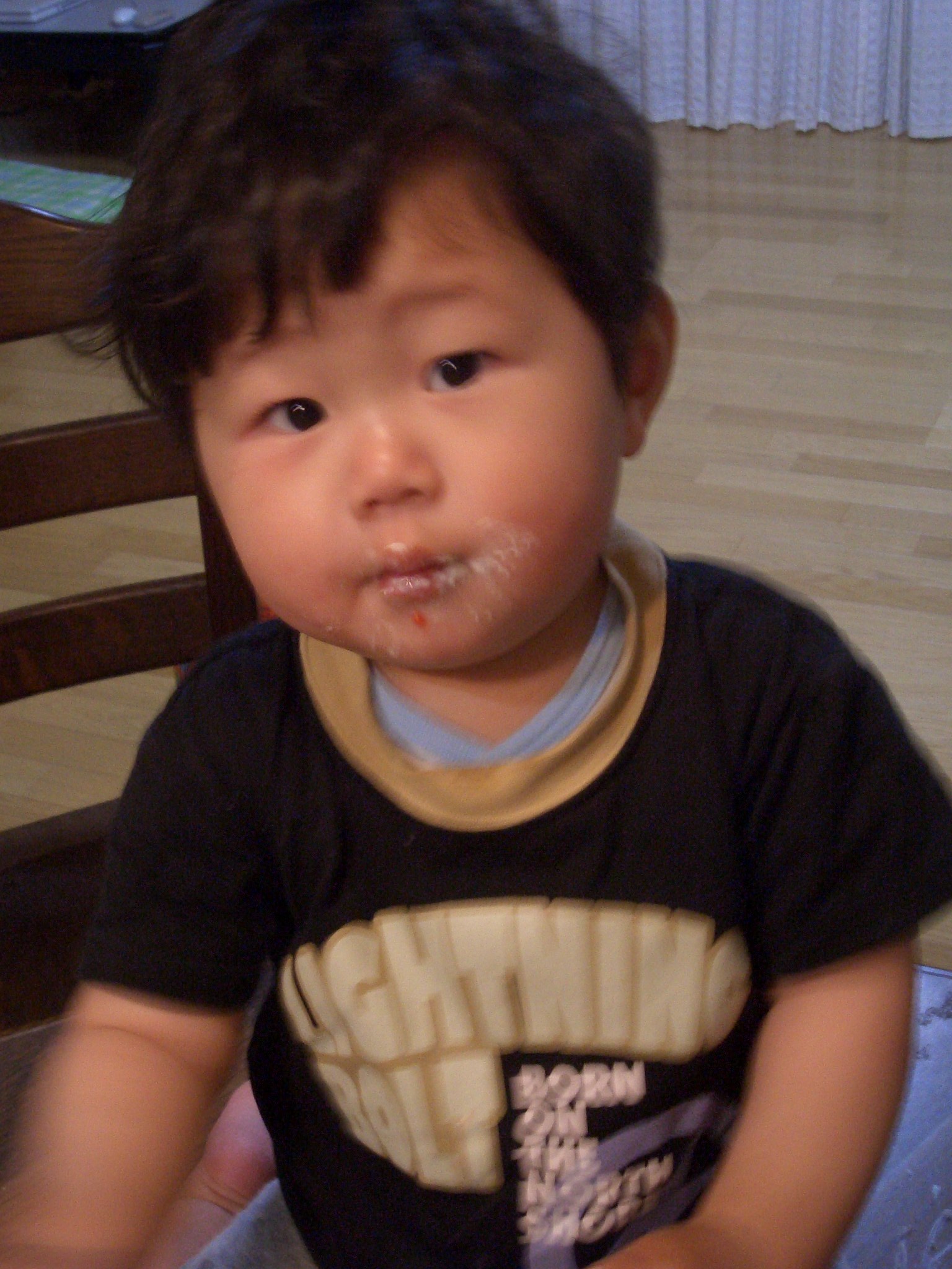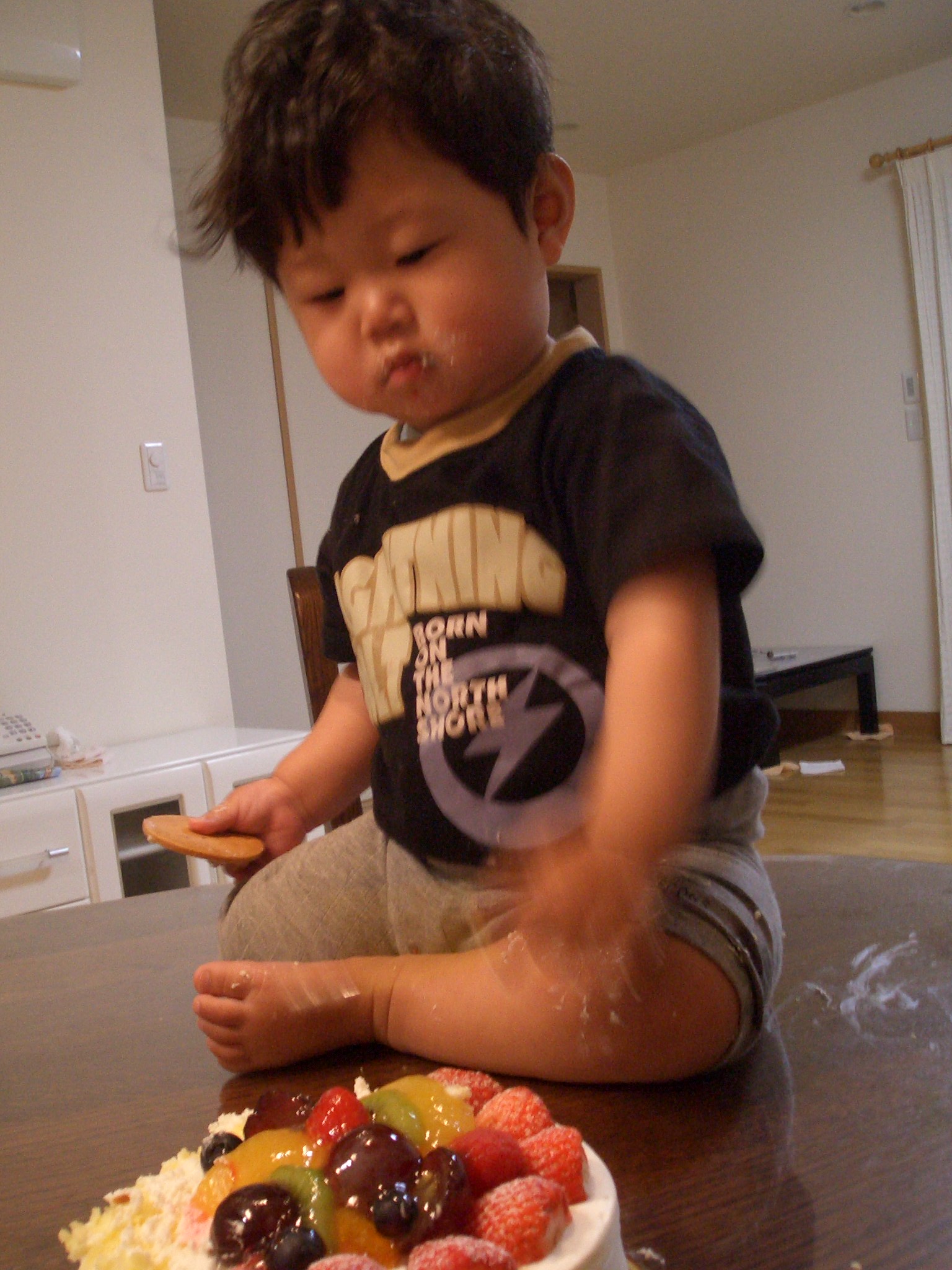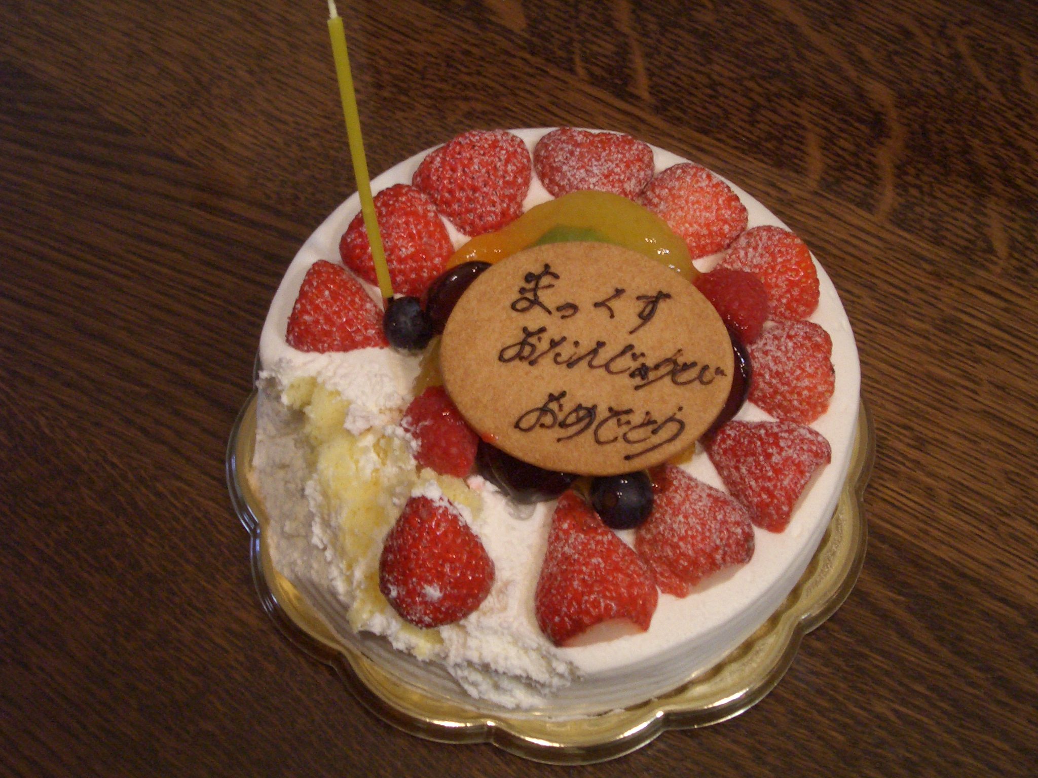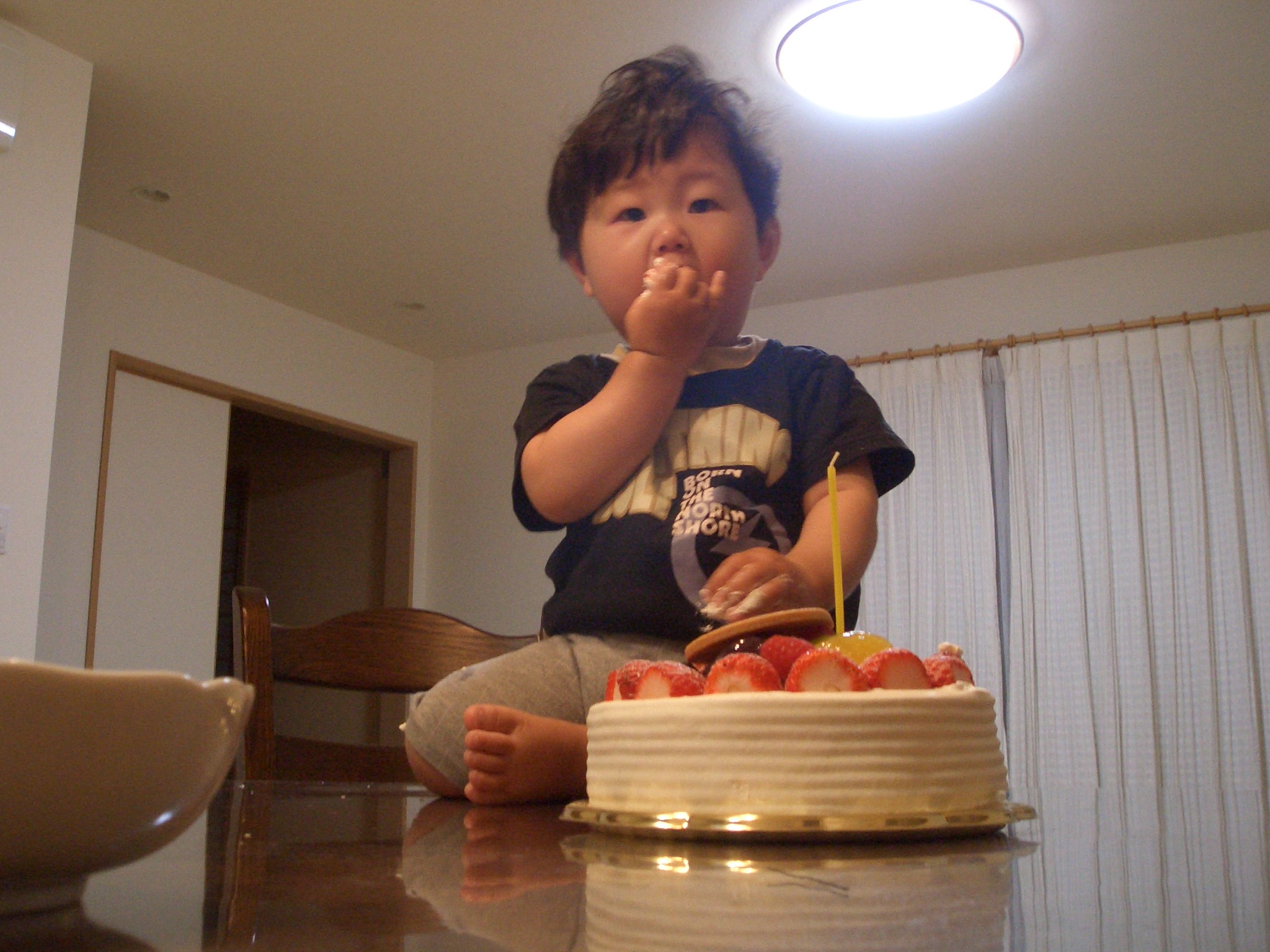 今日は、家族だけで誕生会。夕方早々と寝てしまったので、大人がご飯を食べてしばらくして無理矢理起こしてのケーキ。(私からするとちょっとびっくりな感覚だったけど)つれあいは、真楠をテーブルにのせ、ケーキと一緒に写真撮影。あっという間にケーキ潰しにかかった真楠。次々とイチゴを口にほおばる・・・。逞しいやつだ!!良い写真が撮れない!と言ってたけど、楽しいひとときだったのでは・・!?