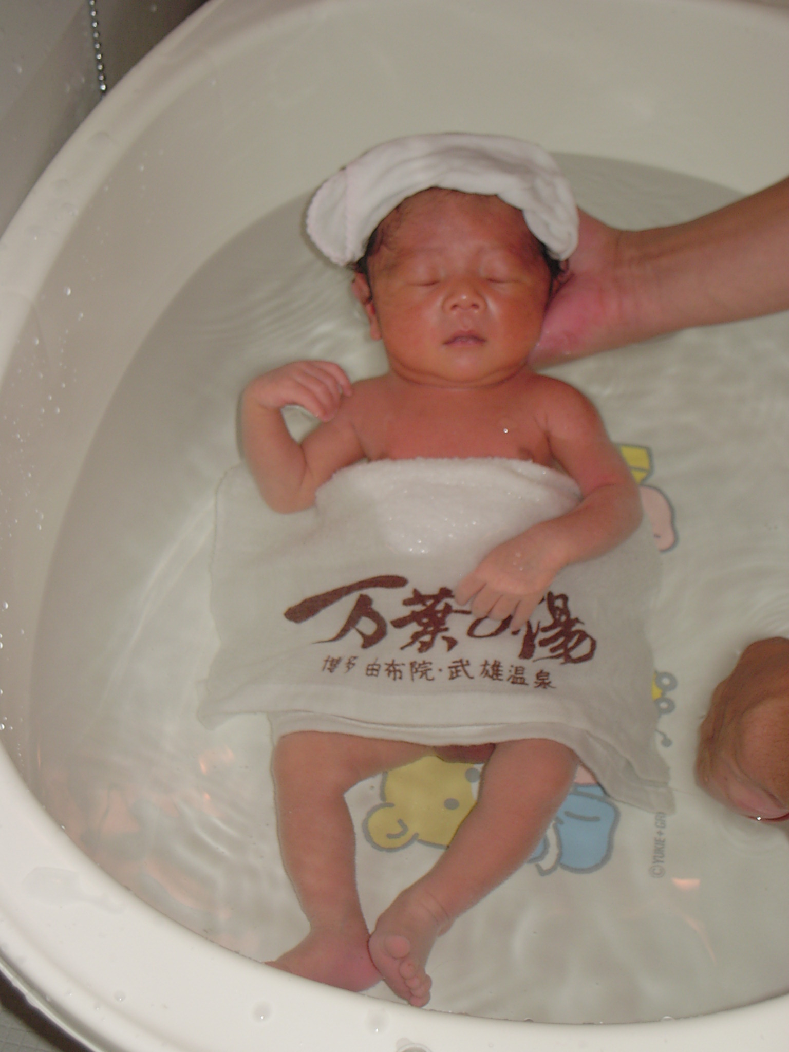 今日は、初沐浴日。沐浴は、よほどの事がない限り、連れ合いにやってもらうつもり。沐浴指導があった時、「誰か手伝ってくれる方いらっしゃいますか?」の問いに、「はい!」と応えたのは、私だけだった。今日は、すべて様子を見せてもらった。真楠の気持ち良さそうな顔。全く泣かないし・・。それにしても、教えてもらってもいないのに、水がかかりそうな時は、すぐに目をつむってりして、赤ちゃんの本能って・・すごい!!つくづく、こんなひと時が、どの子もあるんだな〜と、ほのぼのモードになった。終わったら、急いでおへその消毒をして、洋服を着せる。おへそも退院が遅かったので、消毒はもう少しで良さそう。